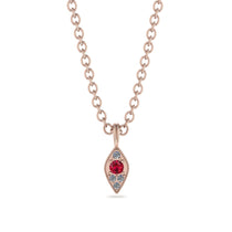 An exquisite vintage-inspired necklace! Crafted in gold,this necklace features an open art-deco pendant accented with five sparkling white Ruby in the petal-shaped pendant, showcasing a vibrant round-cut Ruby in the center. Complete with milgrain detailing, this pendant is adorned on a matching 18-inch chain securing with a spring-ring clasp.