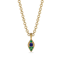 An exquisite vintage-inspired necklace! Crafted in gold,this necklace features an open art-deco pendant accented with five sparkling white Sapphire in the petal-shaped pendant, showcasing a vibrant round-cut Sapphire in the center. Complete with milgrain detailing, this pendant is adorned on a matching 18-inch chain securing with a spring-ring clasp.