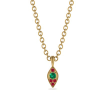 An exquisite vintage-inspired necklace! Crafted in gold,this necklace features an open art-deco pendant accented with five sparkling white Emerald in the petal-shaped pendant, showcasing a vibrant round-cut Emerald in the center. Complete with milgrain detailing, this pendant is adorned on a matching 18-inch chain securing with a spring-ring clasp.