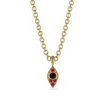 An exquisite vintage-inspired necklace! Crafted in gold,this necklace features an open art-deco pendant accented with five sparkling white black diamond in the petal-shaped pendant, showcasing a vibrant round-cut black diamond in the center. Complete with milgrain detailing, this pendant is adorned on a matching 18-inch chain securing with a spring-ring clasp.