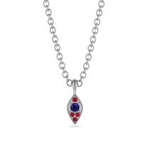 An exquisite vintage-inspired necklace! Crafted in gold,this necklace features an open art-deco pendant accented with five sparkling white Sapphire in the petal-shaped pendant, showcasing a vibrant round-cut Sapphire in the center. Complete with milgrain detailing, this pendant is adorned on a matching 18-inch chain securing with a spring-ring clasp.