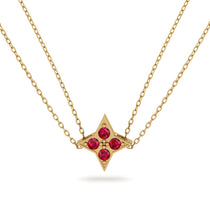 A cheerful accessory for a very special woman, this marvelous Gold Ruby Star Necklace is the perfect accessory for your true love! This necklace has been crafted in gold with four round Ruby set in the pendant that hangs from the double cable chain. So be the star of the night by wearing this shining Ruby pendant.