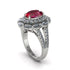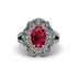 This stunning engagement ring features an elegant oval-cut Ruby center stone surrounded by a breathtaking halo of round brilliant and marquise-cut accent Diamond. The ring's band has a split shank design set with smaller round accent stones on both sides, creating a stunning visual effect. With its distinctive double halo and split shank, this ring exudes sophistication and romance, making it the perfect symbol of your eternal commitment. Embark on your journey together with a ring as extraordinary as your love.