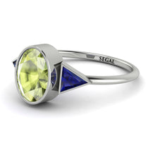 Timeless and graceful, this Geometrical Bezel Peridot Ring is just what you need for a special occasion. This Geometrical Bezel Peridot Ring consists of a comfortable band and an Oval central Peridot, with two second triangle stones next to it. With this stunning Geometrical Bezel Peridot Ring you’ll want to wear forever