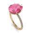 Get yourself a top quality and irresistible ring with this Hidden Halo Oval Pink Moissanite Engagement Ring. It consists of a thin band with an oval center stone, and round stones covering the band itself. The ideal blend of high quality and stunningly beautiful design is within your grasp with this Hidden Halo Oval Pink Moissanite Engagement Ring.