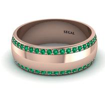 He's the man you can't wait to spend forever loving. On your wedding day, give him the perfect band as a symbol of your matrimony and commitment. Set gold, this handsome style lights up with round Emerald lining the edges of the band.