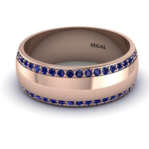 He's the man you can't wait to spend forever loving. On your wedding day, give him the perfect band as a symbol of your matrimony and commitment. Set gold, this handsome style lights up with round Sapphire lining the edges of the band.