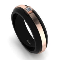 Unique black wedding band for man, made of highly-durable black titanium, covered with golden line and crowned with beautiful 0.05Ct diamond. The ring, that he will love to wear anytime, anywhere.