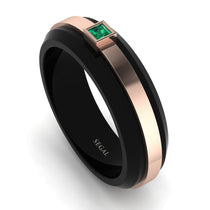 Unique black wedding band for man, made of highly-durable black titanium, covered with golden line and crowned with beautiful 0.05Ct Emerald. The ring, that he will love to wear anytime, anywhere.