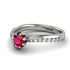 This delicate Ruby engagement ring is a timeless classic of jewelry reinvented in modern forms. This ring is a classic round 0.25 carat Ruby engagement ring with an additional stone in the center and the ring's sides.
