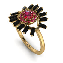 This lovely Round and Baguette Ruby Vintage Engagement Ring will represent a symbol of elegance and luxury which makes you feel beautiful and confident. Its center stone is round, surrounded by smaller, round stones . Finally, baguette shaped stones surround these, to complete the classy look. This Round and Baguette Ruby Vintage Engagement Ring will be a stunning addition to your finger.
