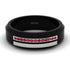 Wedding band that will make him impressed. Beautiful and stylish black titanium ring decorated with two golden lines and set of 13 top-notch Rubys. A unique gift that he will love to wear every day of his life.