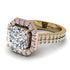 This Gorgeous Radiant Cut diamond Pave Double Shank Engagement Ring with Hidden Stone is a uniquely fresh approach to classic Double Shank Engagement Rings. Beautiful radiant cut 2ct center stone with a sparkling halo of stones around, elegant pave of stones and dazzling surprise stone inside the ring will make her fall in love with this set at first sight.