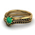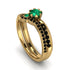 This delicate Emerald bridal set is a timeless classic of jewelry reinvented in modern forms. This set is a classic round 0.25-carat Emerald engagement ring with an additional stone in a center and on the ring's sides and a gorgeous thin wedding ring as a stunning complement to the main ring. The special mechanism will not let the two rings separate while they are put on the finger and can be separated only when the set is taken off.