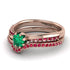 This delicate Emerald bridal set is a timeless classic of jewelry reinvented in modern forms. This set is a classic round 0.25-carat Emerald engagement ring with an additional stone in a center and on the ring's sides and a gorgeous thin wedding ring as a stunning complement to the main ring. The special mechanism will not let the two rings separate while they are put on the finger and can be separated only when the set is taken off.