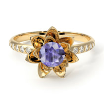 Yellow Gold 0.5 Carat Round Cut Tanzanite Pave Flower Engagement Ring - Her name is simply... 'Lotus'. This Beautiful unique Gold Lotus flower engagement ring is one of my personal favorites and best creations. The Lotus flower is considered by many cultures to be a symbol of Rebirth, Purity and exquisite unparalleled beauty. There is no doubt this ring is the perfect match for those special and unique women out there.