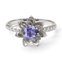 White Gold 0.5 Carat Round Cut Tanzanite Pave Flower Engagement Ring - Her name is simply... 'Lotus'. This Beautiful unique Gold Lotus flower engagement ring is one of my personal favorites and best creations. The Lotus flower is considered by many cultures to be a symbol of Rebirth, Purity and exquisite unparalleled beauty. There is no doubt this ring is the perfect match for those special and unique women out there.