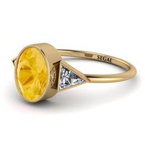 Timeless and graceful, this Geometrical Bezel Citrine Ring is just what you need for a special occasion. This Geometrical Bezel Citrine Ring consists of a comfortable band and an Oval central Citrine, with two second triangle stones next to it. With this stunning Geometrical Bezel Citrine Ring you’ll want to wear forever