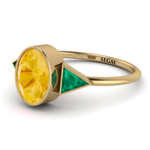 Timeless and graceful, this Geometrical Bezel Citrine Ring is just what you need for a special occasion. This Geometrical Bezel Citrine Ring consists of a comfortable band and an Oval central Citrine, with two second triangle stones next to it. With this stunning Geometrical Bezel Citrine Ring you’ll want to wear forever