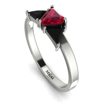This Triangle Ruby Engagement Ring is a graceful and elegant ring, and you’ll definitely fall in love with it. It has a striking calf shaped Ruby on the top and two triangle shaped stones on the sides of the center one, while the band of the ring is circular. If you’re still undecided and want something comfortable, choose this Triangle Ruby Engagement Ring.