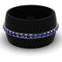 Designed for a modern man on the go, created from high-performance metals that are durable, comfortable and fashionable. This men's wedding band features Sapphire studded in the center and is fashioned in black titanium and is 6.0mm wide. Custom-made to fit his ring size. Black Titanium rings cannot be resized after purchase. The inside of the band is rounded for comfort.