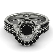 My ‘Elena’ Rose Black diamond ring brings the beauty of Flowers and Diamonds together in one exquisite and comfortable ring. Nestled in the center of the flower is a single Natural Black Diamond, flanked on either side by 5 smaller natural diamonds. With a matching band that nested on the engagement ring. Set in solid 14K Rose gold, this vintage antique engagement ring is sure to make her throw her arms around you, give you a huge kiss and say yes!