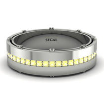This listing is just for you. Mark your special day in style with this diamond wedding band for him. Crafted in polished and satin-finished gold, this wide band shimmers with princess cut yellow diamond in a channel along the center of the satin-finished stripe. Polished grooves and outer borders flank the design. Custom-made to fit his ring size.