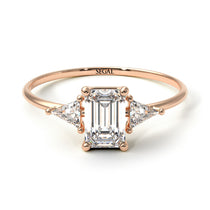 Blending charm and style with comfort, this Emerald Cut diamond with Triangles Ring consists of a band with an emerald shaped center stone, which has two triangle shaped stones on the sides. It will be stunning on your finger. With its minimalist and geometrical design, you’ll love this Emerald Cut diamond with Triangles Ring.