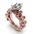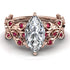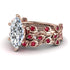The Marquise Diamond Golden Leaf Bridal Set is an enchanting symbol of eternal love and nature-inspired elegance. At its heart, the set showcases a breathtaking 2-carat marquise-cut Diamond, celebrated for its elongated shape and unmatched brilliance. The central Diamond is securely set in a sophisticated six-prong setting, emphasizing its striking form and maximizing its sparkle.The bands are a true masterpiece of craftsmanship, designed to resemble an intricate vine of golden leaves. Each leaf cradles a shimmering round-cut Ruby, representing delicate drops of dew caught in the morning sun. The graceful, intertwined design captures the harmony and beauty of nature, making this set a timeless expression of love and unity.