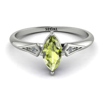 Mix up your style with a bit of orderly appeal with this fascinating Marquise Peridot Geometric Engagement Ring. This Marquise Peridot Geometric Engagement Ring is a circular band with a marquise center Peridot and two round stons on its sides. These stones are in lovely geometric seats. With this Marquise Peridot Geometric Engagement Ring, you get a ring with both luxury and style meshed within it.