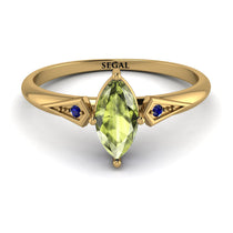 Mix up your style with a bit of orderly appeal with this fascinating Marquise Peridot Geometric Engagement Ring. This Marquise Peridot Geometric Engagement Ring is a circular band with a marquise center Peridot and two round stons on its sides. These stones are in lovely geometric seats. With this Marquise Peridot Geometric Engagement Ring, you get a ring with both luxury and style meshed within it.