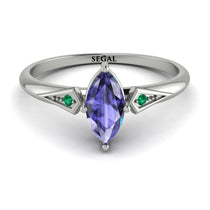 Mix up your style with a bit of orderly appeal with this fascinating Marquise Tanzanite Geometric Engagement Ring. This Marquise Tanzanite Geometric Engagement Ring is a circular band with a marquise center Tanzanite and two round stons on its sides. These stones are in lovely geometric seats. With this Marquise Tanzanite Geometric Engagement Ring, you get a ring with both luxury and style meshed within it.