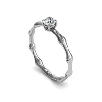 White Gold 0.25 Carat Round Cut Diamond Delicate Designer Engagement Ring - Simplistic, elegant, individualistic. This solitaire engagement ring hosts a single glistening stone on a bamboo-inspired band for an overall look that’s neat and polished. Bamboo stalks are a symbol of tranquility and friendship, which makes this ring a perfect first step toward a happy, peaceful life together. The setting includes four prongs and our signature inscription – a telltale indicator of quality.